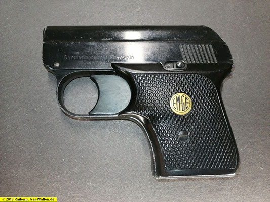 Weitere Beschriftungen sind lediglich auf den schwarzen Kunststoffgriffschalen zu finden. Die Griffschalen weisen ein rundes Metall-Emblem auf, links mit dem Logo „EM-GE“ und rechts mit „MODELL 6G“. Auch hier werden die Griffschalen jeweils mit einer Schraube am Gehäuse befestigt. Die Sicherung befindet sich auf der linken Seite und ist noch im oberen Rand der Griffschale und im unteren Rand des Oberteiles waagerecht eingelassen. Auf der Unterseite, im Griff eingelassen, befindet sich der ausklappbare Hülsenausstoßer der zugleich im geöffneten Zustand das Magazin transportiert und den Schlaghebel sperrt, so dass er keine Patronen zünden kann. Das Modell 6G ist etwas kürzer als das Modell 6B und enthält eine geänderte Mechanik.