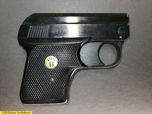 Hier handelt es sich um eine brünierte Pistole die für Patronen im Kaliber 6 mm Flobert Platz und Gas eingerichtet ist. Der Lauf mit seinen Längsrillen ist dazu geeignet Gasvorsatzhülsen und Signalsterne von 7 mm Durchmesser aufzunehmen. Im Lauf ist auch ein Gewinde vorhanden in das ein Signalbecher eingeschraubt werden kann um größere Signalsterne von 15 mm Durchmesser verschießen zu können.